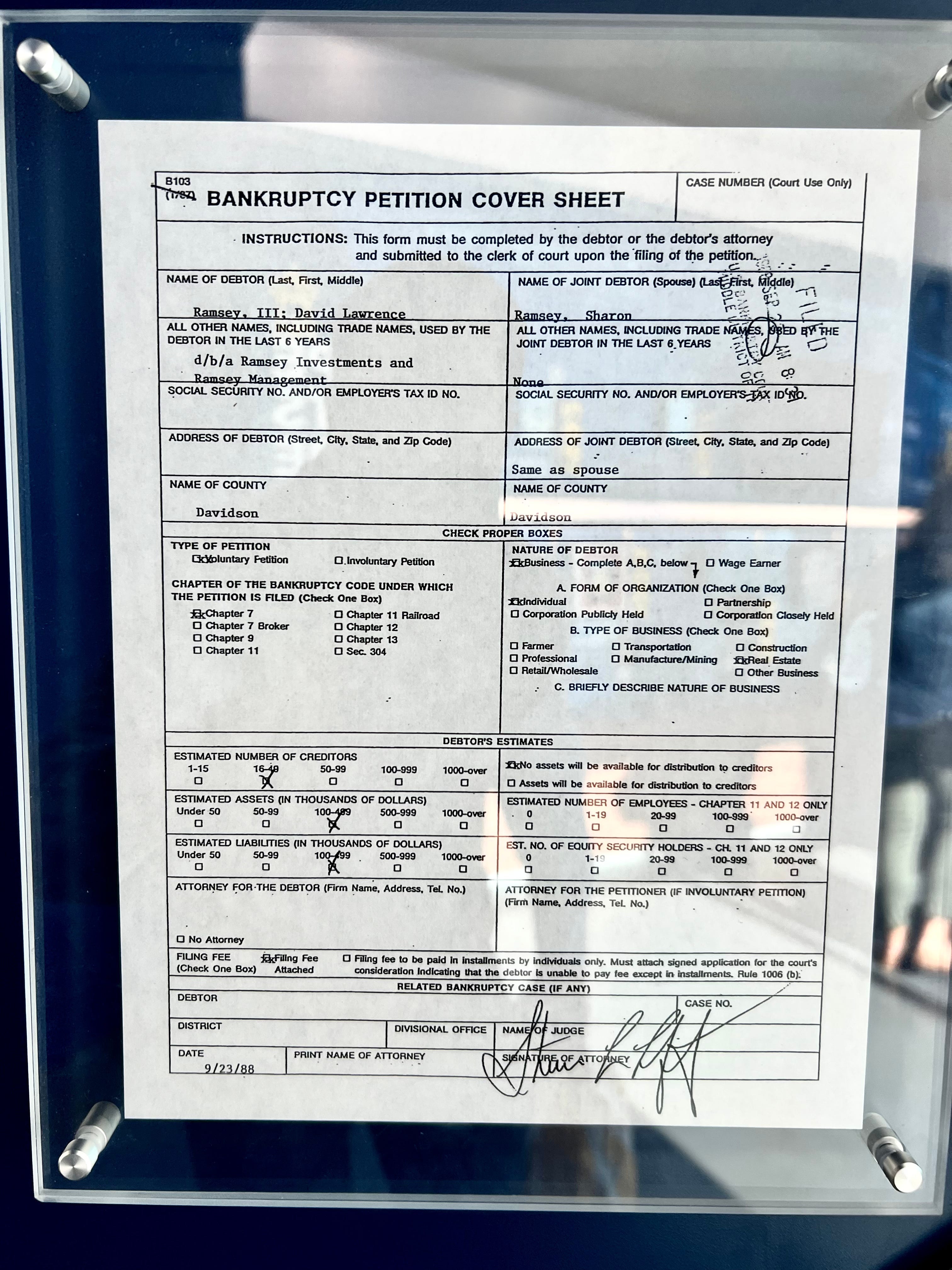 The Ramseys declared bankruptcy on September 23, 1988 and his bankruptcy petition is hanging on the wall at Ramsey Solutions.