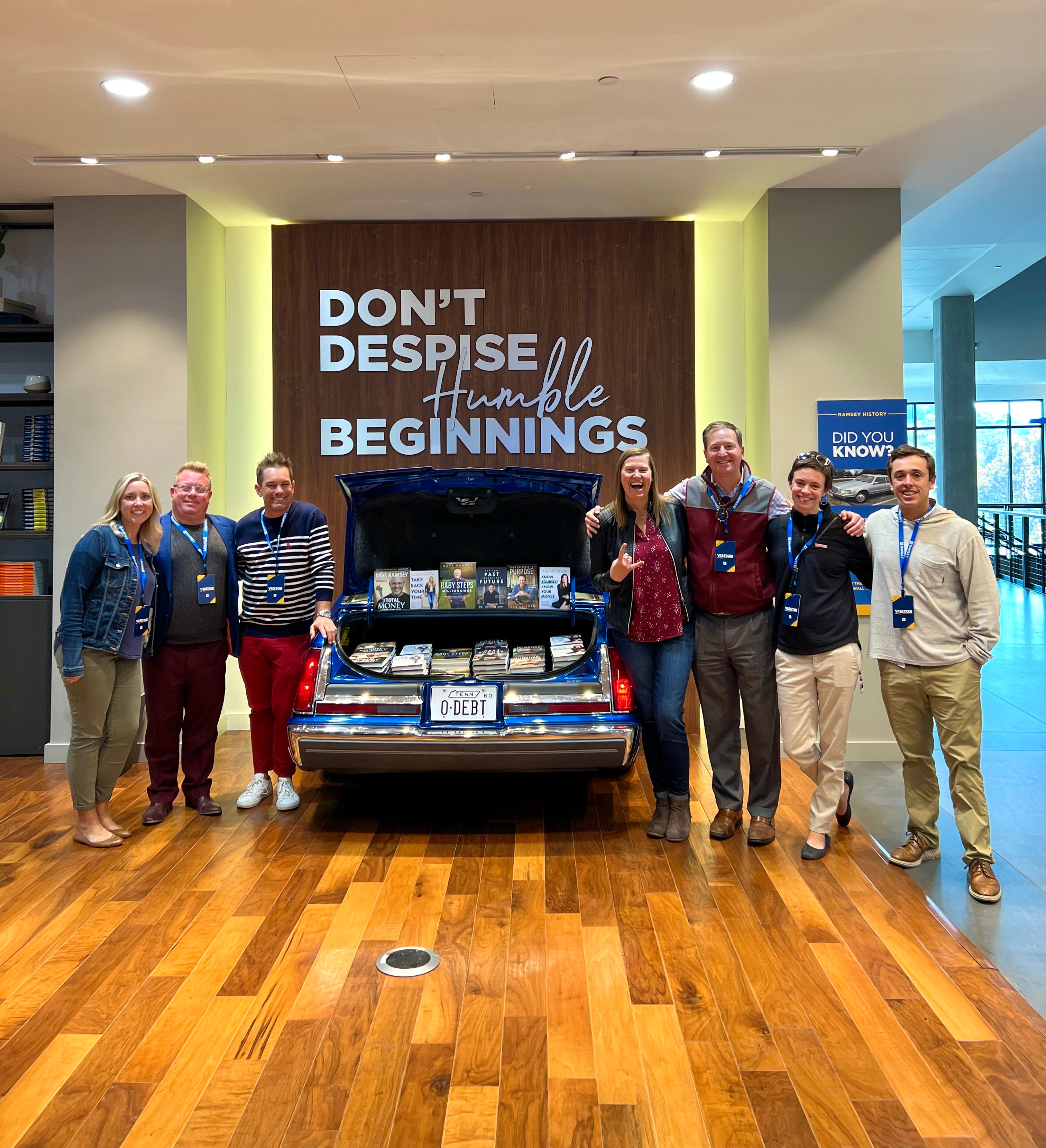 While the Ramsey Solutions headquarters and its entire operation is so big, Carolyn started our tour by reminding us that Dave Ramsey started with humble beginnings. We took the photo below next to a remake of a trunk of a car. This symbolizes how Dave sold his first self-published book out of the trunk of his car in the 1980s.